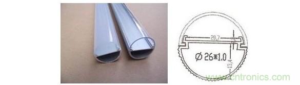 這種半圓柱的表麵積為:2πR*h/2=πR*h。對於T8燈管來說,它的直徑為26mm,所以半徑為13mm。1.2米的T8燈管,其表麵積為:π*1.3+120=490cm2,我們知道LED散熱器的表麵積通常要求60cm2/W。,所以這種半鋁管隻能散8W左右的熱量。而T8型LED日光燈通常輸入功率為20W,假定LED的發光效率隻有20%,那麼有16W的輸入電功率都變成熱量。而現在隻能散去8W的熱量,而還有8W的熱量無法散去,其結果就是使得LED的結溫升高,壽命縮短。