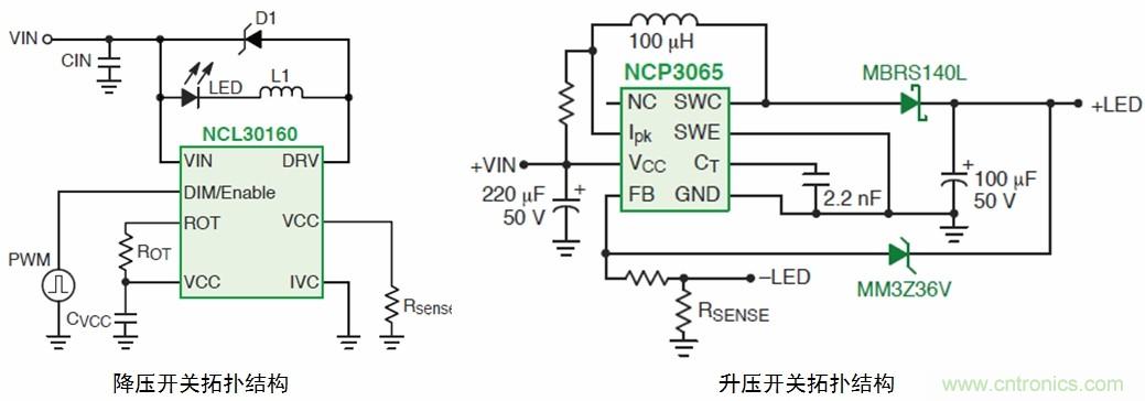 用於中等電壓通用照明的開關驅動器有多種拓撲,如降壓、升壓;降壓/升壓的NCP3065和NCP3066(可以配置為控製器)、NCP3163、MC33163、NCP1294;降壓的CAT4201、NCP1034、NCL30100、NCL30105、NCL30160、NCL30161;此外還有升壓或SEPIC的CS5171/3。