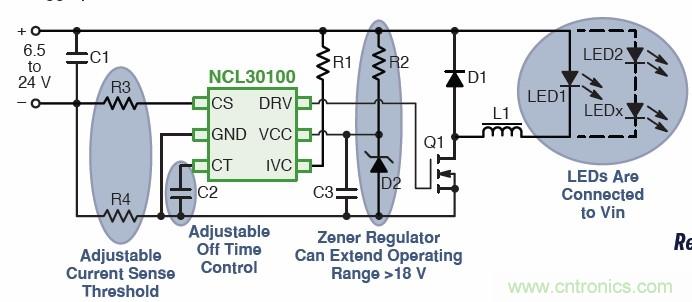 針對空間及高能效要求的低功率應用,安森美半導體提供一款能效高達95%,又具有自然LED開路保護的固定關閉時間降壓LED驅動器控製器NCL30100。該器件采用準固定關閉時間、峰值電流遲滯控製方法,不要求補償元件;其低邊N-FET開關拓撲適合連續導電模式工作,無須輸出電容;其工作頻率小於500 kHz,±5%典型穩流容限,VCC工作電壓範圍為6.35至18 V。