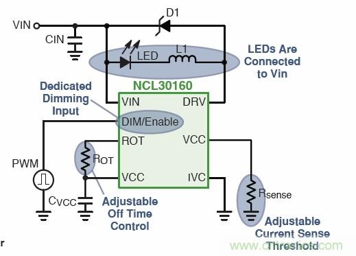 大功率LED可采用安森美半導體的恒流降壓LED驅動器NCL30160,實現高達98%的能效。它采用30 mΩ集成MOSFET,100%占空比可提供高能效;輸入電壓範圍為6.3 V至40 V,開關頻率可達1.4 MHz;還具有專用PWM調光引腳/低功率關閉、無須控製環路補償和1.5 A平均電流能力。
