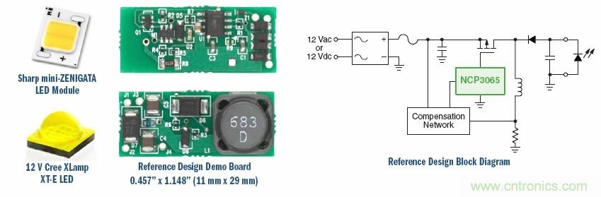 對於3至4個LED模塊的12 V AC-DC設計,可以使用安森美半導體針對NCP3065的評估板NCP3065BBGEVB,用來驅動12 Vac/Vdc應用中的夏普ZENIGATA™、Cree XLamp™MC-E及其他LED模塊。其特點是小尺寸、寬輸入和輸出工作電壓,輸出電流經過穩流,還具有LED開路保護、輸出短路保護能力。該解決方案適用於MR16燈泡、景觀照明、交通照明。