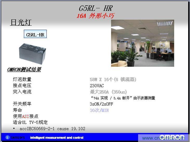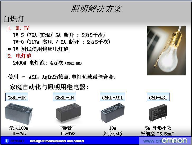 我們實際客戶應用的案例,我們在推廣客戶的過程中,形成了一些實際的應用案例,在實現照明係統和家電自動化的領域,在節能領域、自(zi)動(dong)化(hua)的(de)領(ling)域(yu)現(xian)在(zai)是(shi)越(yue)來(lai)越(yue)高(gao)了(le),目(mu)前(qian)歐(ou)姆(mu)龍(long)的(de)繼(ji)電(dian)器(qi)在(zai)日(ri)光(guang)燈(deng)這(zhe)塊(kuai)直(zhi)接(jie)的(de)應(ying)用(yong)可(ke)以(yi)運(yun)用(yong)繼(ji)電(dian)器(qi)作(zuo)為(wei)啟(qi)用(yong)的(de)電(dian)阻(zu)。繼(ji)電(dian)器(qi)也(ye)就(jiu)是(shi)高(gao)級(ji)一(yi)點(dian)的(de)器(qi)開(kai)關(guan)。在(zai)模(mo)塊(kuai)上(shang)麵(mian),也(ye)是(shi)用(yong)來(lai)控(kong)製(zhi)鎮(zhen)流(liu)器(qi)的(de)。在(zai)另(ling)外(wai)一(yi)個(ge)人(ren)體(ti)、物體探照這塊,我們也會有MEMS非接觸係統的微溫度傳感器。按照設計的過程中,就是在信號繼電器和MEMS非接觸溫度傳感器繼電器上都有應用,但是還沒有成功案例,所以上麵就打了問號。