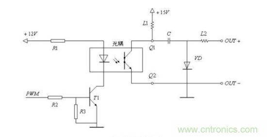限於篇幅有限,下麵僅對此PWM控製電路進行簡單的介紹:當PWM控製信號為低電平時,晶體管T1處於截止狀態,光電耦合器中發光二極管的電流近似為零,輸出端Q1和Q2間的電阻很大,相當於開關“斷開”;當PWM波控製信號為高電平時,晶體管T1處於導通狀態,光電耦合器中發光二極管發光,輸出端Q1和Q2間的電阻很小,相當於開關“導通”.由上麵介紹可知,當DS18B20采集的實時溫度小於製冷啟動溫度時,光電耦合器的PWM輸入端無信號輸入時,光電耦合器處於不工作狀態,圖5中的OUT+端和OUT-端無輸出電壓,即半導體製冷片處於閑置狀態;當DS18B20采集的實時溫度大於製冷啟動溫度時,光電耦合器的PWM輸入端有信號輸入,圖3中的OUT+端和OUT-端即有輸出電壓。通過PWM調製波控製Q1和Q2兩端的通斷,即可實現對半導體製冷片TEC工作電壓的控製,進而控製了半導體製冷片TEC的散熱功率。圖3中的OUT+端和OUT-端分別接在半導體製冷片TEC的輸入端線上。根據CUK電路的輸出電壓和供電電源電壓的關係,可得出PWM波占空比和半導體製冷片TEC輸入電壓的關係:
