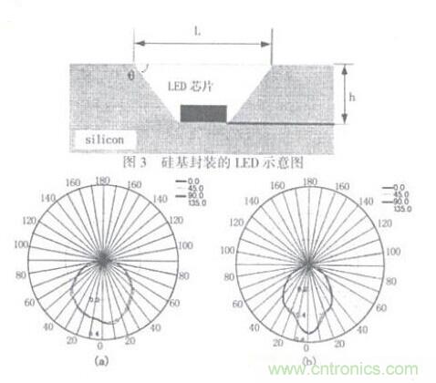 MEMS技術是隨著半導體和微電子技術的發展麗發展起來的一項新興的細微加工技術,加工尺寸從毫米到微米數量級,甚至亞微米的微小尺寸:其加T藝主要分為表麵工藝和體工藝。基於矽基的體工藝又稱為體矽工藝,體矽工藝嗬以在矽基體上形成高深寬比的凹稽。由於MEMS的加工尺寸很小,因此利用該技術形成的微小凹槽作為LED芯片封裝的反射腔(如圖3),將會克服目前LED芯片直接封裝在PCB板上而引起發光效率低的問題;同時由於矽具有良好的導熱特性,因此可以降低目前封裝中熱阻高的問題,從而提高LED芯片的發光效率和可靠性。圖4(a)和(b)給出了當LED芯片直接貼裝在PCB板上和貼裝在有凹槽的矽基上的發光特性。從圈中可以看出,LED貼裝在帶有凹槽的矽基上以後其發出光的發散性能得到了很大的改善,LED的發光強度提高了75%以上。