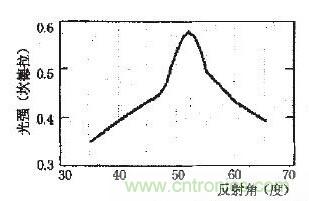 圖5為LED發射光與反射的反射角θ之間的關係,從圖中可看出當反射角為52度的時候反射光強取得最大。從理論上講,矽凹槽反射角應該設計為52度。但是,考慮到對(100)矽進行腐蝕的時候,其(111)麵和(100)麵會自動形成一個54.7度的角,而通過仿真分析結果可以計算。當反射角為54.7度的時候。LED的反射光強隻比反射角為52度的時候小12%,而且光強分布也比較接近。因此在腐蝕凹槽的時候可以直接采用矽的(100)麵和(111)麵形成角度作為反射角,這可以極大的簡化加工工藝,降低製造成本,而且對LED光強的影響也不是很大。