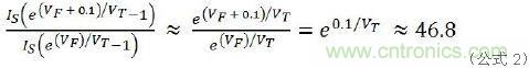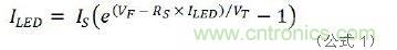下麵是圖1a行不通的原因所在。在公式1中,IS、RS是常數,取決於LED產品本身,與VT是熱電壓無關。假設串聯電阻RS是理想值零,那麼僅0.1V的VF變化就會產生47倍的ILED差異。
