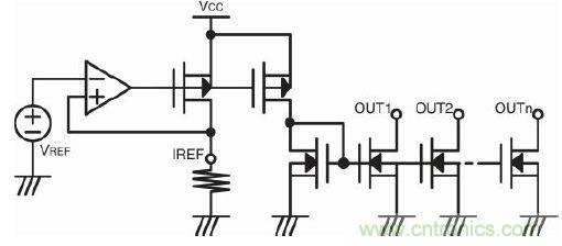 此外,我們都知道集成電路(IC)可提供良好的匹配電路對。這也是選擇恒流法的另一個優勢。圖2是LED驅動器的基本輸出級結構。市場上很多LED驅動器IC都有參考電流設置端 IREF,該參考電流是鏡像到其輸出端的恒流。