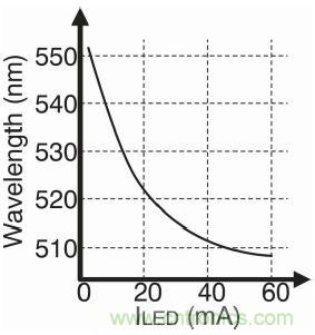 這時候,需要考慮電流變化對LED光輸出波長值的影響。改變波長就意味著改變人眼看到的色彩。圖4是綠色LED燈的實例。通常在業界,510nm 廣泛代表綠色。因此,大部分LED燈製造商所設計的LED燈產品在最大額定電流下都具備510nm的波長。在圖4中,隨著LED電流的升高,波長可達到510nm。獲得綠色的最佳方法是盡量使燈的驅動電流接近最大額定值。這也就說明了為什麼使用數字控製比使用模擬控製好。