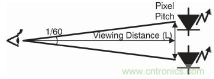 一套LED顯示係統包含大量的LED燈和一個大電源。設計係統時需要重點考慮LED燈的密度優化問題。LED 燈(deng)的(de)該(gai)密(mi)度(du)稱(cheng)為(wei)每(mei)個(ge)像(xiang)素(su)的(de)距(ju)離(li)或(huo)像(xiang)素(su)間(jian)距(ju)。如(ru)果(guo)像(xiang)素(su)間(jian)距(ju)太(tai)密(mi),一(yi)旦(dan)超(chao)出(chu)了(le)人(ren)眼(yan)能(neng)識(shi)別(bie)的(de)精(jing)度(du),它(ta)就(jiu)不(bu)會(hui)改(gai)善(shan)影(ying)像(xiang)輸(shu)出(chu)質(zhi)量(liang),而(er)且(qie)會(hui)增(zeng)加(jia)成(cheng)本(ben)。人(ren)眼(yan)可(ke)識(shi)別(bie)的(de)兩(liang)個(ge)單(dan)光(guang)源(yuan)是(shi)在(zai)這(zhe)兩(liang)點(dian)形(xing)成(cheng)1個弧度的1/60(=1 弧分)時。