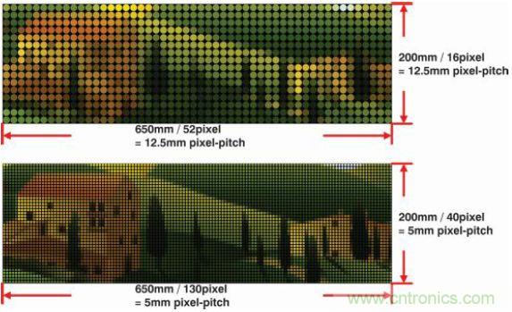 例如,5m視距的係統需要5mm像素間距來實現良好分辨率。另一個視覺實例如圖7所示,圖中展示了過低像素間距如何降低輸出影像質量。像素間距為12.5mm 的影像(上)看起來很粗糙,無法近距離辨識。但保持一定的距離觀看時影像開始變得清晰,與觀看像素間距為5mm的影像(下)類似。這個實例清楚地說明了視距與像素間距的關係。