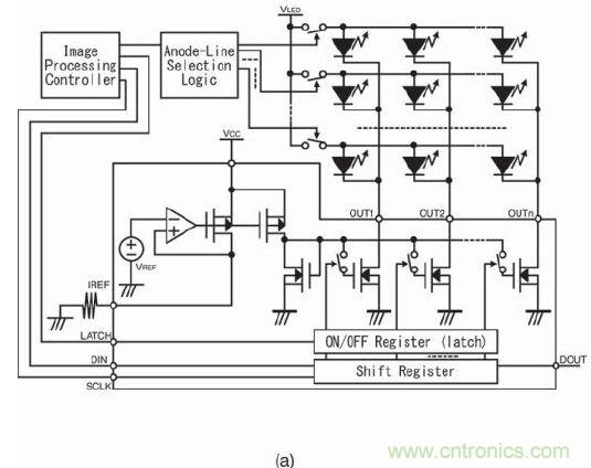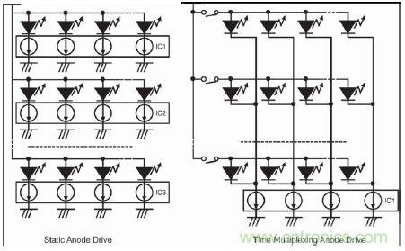 從圖2可以看出,LED燈的陰極采用當前市場常見的LED驅動器IC驅動。這裏要討論LED燈的陽極驅動器電路。陰極采用恒流驅動器有優勢,陽極希望也隻提供足夠的電壓。但仍需做出如何驅動陽極的重要決定!