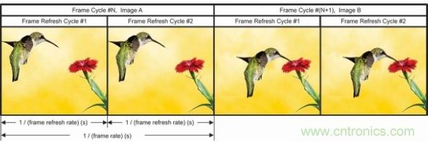 為滿足更快運行這一要求,很多LED顯示係統都在一個幀周期內反複顯示相同的影像,稱為幀刷新率。圖10是幀速率與刷新率的關係。隻有兩張幀影像:A 和 B。每個幀重複“影像 x”兩次。因而本實例“幀刷新率”= 2 ד幀速率”。