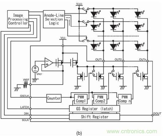 圖11b是采用PWM控製IC的係統,具有一個可參考時鍾計數器的灰階參考時鍾輸入端。另外,該IC還具有一組保存灰階邏輯代碼的寄存器。PWM 比較器可通過計數器和灰階 (GS)寄存器比較和生成PWM輸出模式。