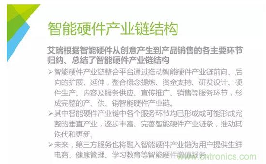 作為此次係列報告的開篇,京東智能與艾瑞對當前智能硬件的產業鏈結構,發布了行業報告《2015中國智能硬件產業係列研究報告——產業鏈圖譜篇》該圖譜對現階段的智能硬件的發展趨勢進行了劃分和定義,並對產業鏈的結構進行了分析。