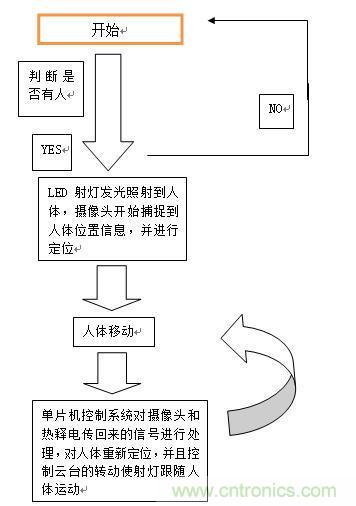 係統初始化之後,對狀態進行判斷,若沒檢測到人,則一直處於檢測狀態;若檢測到有人,則單片機控製IO口打開開關使得LED射燈發光照射到人體,攝像頭開始捕捉人體位置信息,並進行定位;當dang人ren體ti移yi動dong時shi,單dan片pian機ji控kong製zhi係xi統tong對dui熱re釋shi電dian和he攝she像xiang頭tou傳chuan回hui來lai的de信xin號hao進jin行xing處chu理li,對dui人ren體ti重zhong新xin進jin行xing定ding位wei,並bing且qie控kong製zhi雲yun台tai轉zhuan動dong使shi射she燈deng跟gen隨sui人ren體ti運yun動dong;當人體再移動,便繼續“人體移動----數據處理---轉動雲台”這個循環過程。