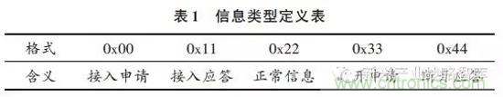以容量為10人的紫外光語音通信係統為例說明數據幀結構的設計。考慮到通常情況下人講話的語速為每分鍾160~180個漢字,在保留一定餘量的情況下,假設每分鍾240個漢字,如果壓縮後的語音信號速率為4.8Kb/s,可以算出平均每個漢字時間內的比特數為1200b。據此設計的數據幀結構如圖3所示,其中數據的信息速率為60Kb/s,信息體長度為1200b,時隙頭長度為96b。時隙頭包括前導序列、信息類型、發送方代號和接收方代號,長度分別為72b,8b,8b和8b。每一個用戶隻處理接收代號和自己的代號一致的時隙。收發雙方作為一個組合占用相鄰的兩個時隙。前導序列為0,1交替的序列,信息類型的定義如表1所示。