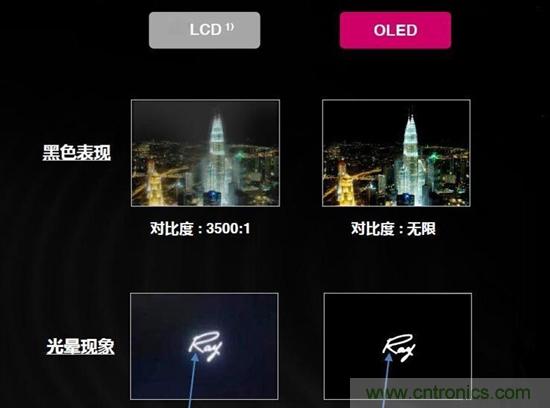 OLED電視由於顯示原理的不同,在畫質方麵相較LCD液晶電視的優勢還體現在它的對比度上,因為OLED的所有像素都是自發光,所以理論上對比度是無限的,因而可以呈現完美的黑色顯示;而LCD電視無法完全遮擋背光源的光線,不可避免出現漏光和光暈現象,並且大部分傳統的LCD電視對比度不到5000:1,播放純黑畫麵時則呈現為深灰色。