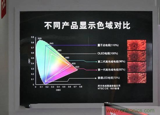 傳說中價格爆炸的OLED電視,色域據說能超過NTSC的範圍,OLED屏幕比普通LCD屏幕的優勢之一也就在這裏;而量子點電視的色域則據說可以超過現在的OLED電視(前不久發布的TCL量子點電視H9700官方稱其色域為110%NTSC)。