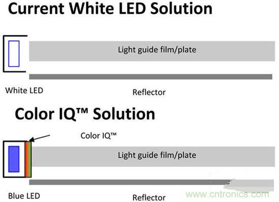 (這是顯示屏背光的橫截麵圖,上方是傳統W-LED背光方案,下圖為量子點背光方案,長條可以理解為燈管,左側即是光源。在量子點背光方案中,除了左側的藍色LED燈外,右邊部分加上了紅色與綠色量子點)