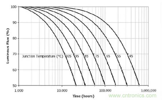 如果環境溫度是105℃,那麼還至少要加上20℃才是結溫,所以結溫就大約是125℃。在這個曲線上已經查不到了,隻能大致地估算其壽命隻有4,000小時。這是絕對不能接受的!也就是說,LED泡殼裏的環境溫度必須大大低於105℃!