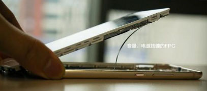 注意音量、電源按鍵的FPC,接口在主板側。按鍵不直接放在主板上還是有點講究的,因為金屬機身遭遇不慎的話可能會變形,而變形後主板與按鍵(鍵帽)之間容易出現錯位從而影響按鍵手感/功能,因此把按鍵整合在後殼上,再用FPC連接主板,怎麼摔按鍵也能按。