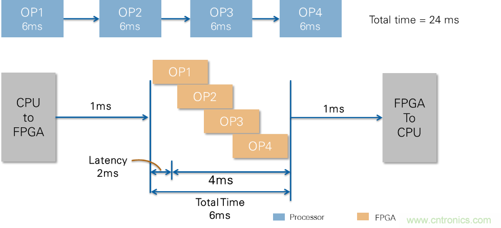 CPU按順序執行操作,因此第一個操作必須在整個圖像上運行結束後,第二個操作才能啟動。在本例中,假設算法中的每個步驟在CPU上運行需要6ms;因此,總處理時間是24毫秒。現在考慮在FPGA上運行相同的算法。由於FPGA本質上是大規模並行的,所以該算法中的四個操作可以同時對圖像中的不同像素上操作。這意味著接收第一個處理的像素僅需2ms的時間,處理整個圖像需要4ms的時間,因而總處理時間為6ms。這比CPU的執行速度快得多。即使使用FPGA協處理架構並將圖像傳輸到CPU,整個處理時間(包括傳輸時間)也比單獨使用CPU要短得多。