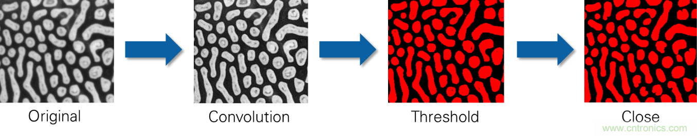 現xian在zai考kao慮lv一yi個ge真zhen實shi的de例li子zi,比bi如ru粒li子zi計ji數shu所suo需xu的de圖tu像xiang。首shou先xian需xu要yao應ying用yong卷juan積ji濾lv鏡jing來lai銳rui化hua圖tu像xiang。接jie下xia來lai,通tong過guo閾yu值zhi運yun行xing圖tu像xiang以yi生sheng成cheng二er進jin製zhi圖tu像xiang。這zhe不bu僅jin可ke以yi通tong過guo將jiang其qi從cong8位wei單dan色se轉zhuan換huan為wei二er進jin製zhi來lai減jian少shao圖tu像xiang中zhong的de數shu據ju量liang,還hai可ke以yi為wei二er進jin製zhi形xing態tai學xue應ying用yong準zhun備bei圖tu像xiang。最zui後hou一yi步bu是shi使shi用yong形xing態tai學xue來lai應ying用yong關guan閉bi功gong能neng。這zhe會hui去qu除chu二er進jin製zhi粒li子zi中zhong的de任ren何he孔kong。