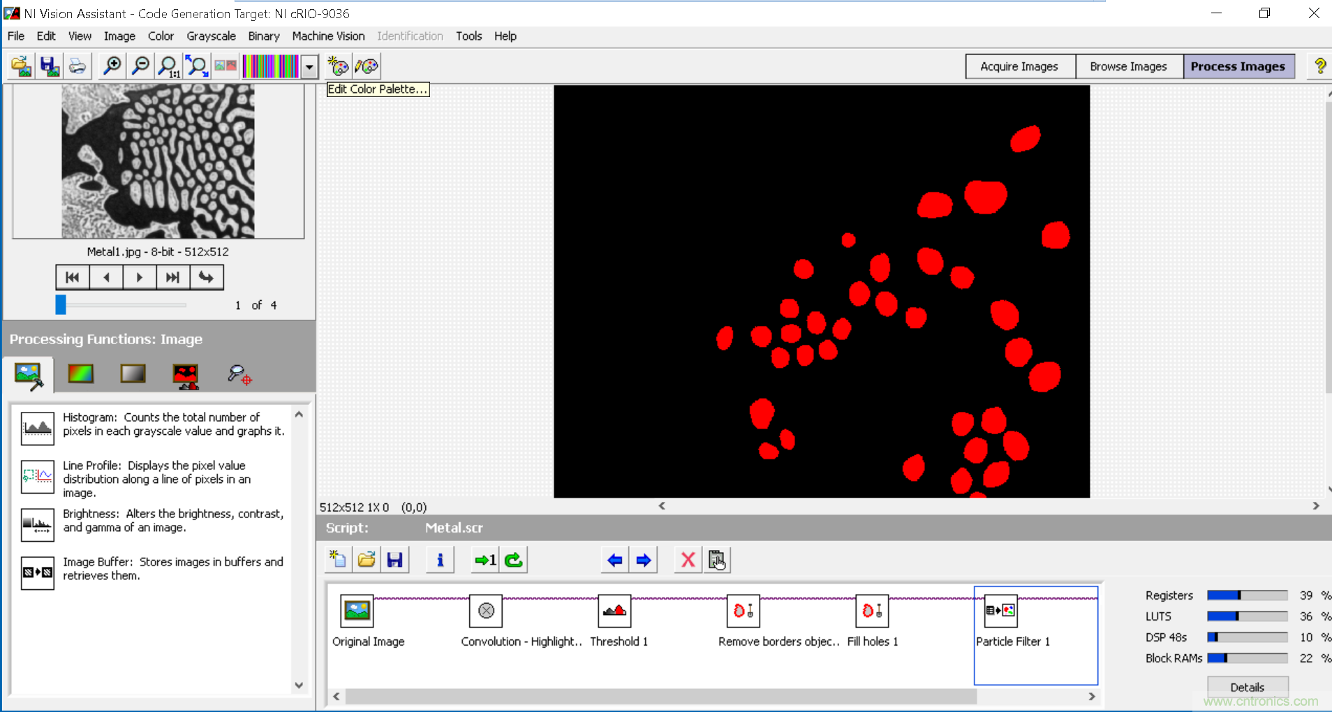 weileshixianshengchanlvdezuidahua,bulunshiyongnazhongchulipingtai,douxuyaolijihuodeguanyusuanfadefankuihejizhunceshixinxi。dangshiyongdiedaitansuoxingfangfashi,shishizhakansuanfajieguojianghuijieshengdaliangshijian。shenmeshizhengquedeyuzhi?yongerjinzhixingtailvboqitichudekeliduodahuoduoxiao?nazhongtuxiangyuchulisuanfahesuanfacanshukeyizuihaodiqinglituxiang?zhexiedoushikaifashijiaosuanfashidechangjianwenti,erguanjianzaiyushifounenggougenggaibingkuaisuzhakanjieguo。raner,chuantongdeFPGA開kai發fa方fang法fa可ke能neng會hui減jian緩huan創chuang新xin,因yin為wei算suan法fa的de每mei個ge設she計ji變bian化hua之zhi間jian需xu要yao編bian譯yi時shi間jian。克ke服fu這zhe一yi點dian的de一yi個ge方fang法fa是shi使shi用yong一yi個ge算suan法fa開kai發fa工gong具ju,可ke讓rang您nin在zai同tong一yi個ge環huan境jing進jin行xingCPU和FPGA的開發工作,而不會在FPGA編譯時陷入困境。NI Vision Assistant是一種算法工程工具,用於開發部署到CPU或FPGA上的算法,以幫助您簡化視覺係統設計。您還可以使用Vision Assistant在目標硬件上編譯和運行之前測試算法,同時輕鬆訪問吞吐量和資源利用率信息。