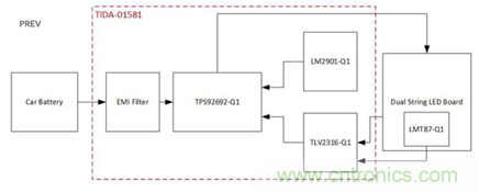 該方案采用升壓配置的TPS92692-Q1多拓撲LED驅動器來驅動LED。TPS92692-Q1具有用於電磁幹擾(EMI)性能的擴頻頻率調製,模擬電流調節和內部脈寬調製(PWM)調光。這種設計包括使用LMT87-Q1的可調線性熱折返模擬溫度傳感器以及電流限製,以防止鏡像串無法打開電路。該設計還具有兩種亮度模式:一種模式是全亮度模式,另一種是降低亮度的PWM調光模式。