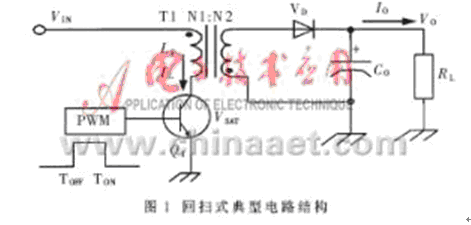 回掃式拓撲電路結構無疑是目前比較理想的多路供電電源電路結構。其峰值電感電流可檢測、輸出電壓擴展性強等特點,極大地提高了控製電路的穩定性和抗幹擾能力,便於供電電源的設計。