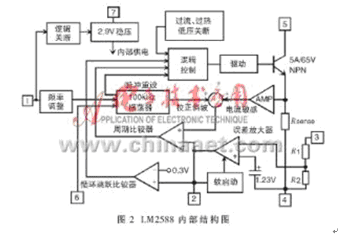 LM2588采用7腳TO-220封裝,主要包括100kHz振蕩器、2.9V穩壓電路、誤差放大器、5A/65V的NPN開關管以及過流、過熱、低電壓鎖定,還包括軟啟動、邏輯關斷、邏輯控製等,內部結構如圖2所示。