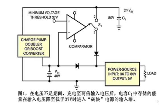 應記住,電容存儲的能量以指數增加,而電容的電壓線性增加。倍增器把C1充電至兩倍輸入電壓或至少為80V。即便假定每10s出現一次5ms電壓不足,用於充電200mF的電流仍僅約為3mA。比較器觀察輸入電壓,並且一旦它降至低於37V,開關S1就會關閉,而來自C1的能量向“磚塊”電源放電。