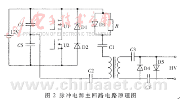脈衝電源整個電路由主電路和控製電路組成。考慮到荷電噴霧基本上都用在室外,主電路的輸入設計為可用蓄電池供電的12V直流電壓,將它加在由電容C4、C5、IGBT大功率管U1、U2和高頻變壓器組成的半橋式逆變電路。控製電路采用PWM方式。控製電路輸出二路彼此絕緣、相位差180°並有一定死區的脈衝。這兩路脈衝分別控製U1、U2的導通和關斷,使得直流電轉換為高頻脈衝。高頻脈衝經脈衝變壓器升壓後輸出高壓高頻脈衝[2-3]。電路如圖2所示。