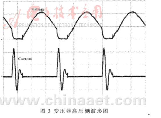 研製的高壓窄脈衝電源改善了高壓荷電係統的性能且穩定性好。實際運行表明,電源輸出電壓峰值為0~30kV,頻率為15kHz,脈寬為500ns~800ns。脈衝供電與直流供電相比,其起暈電壓低50%以上。此種電源功率變壓器的輸入頻率大幅度提高,同時變壓器和平波電抗器體積重量大為減小,且電源輸出紋波小、響應速度快。變壓器高壓側波形如圖3所示。
