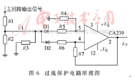 過電流保護電路的主要任務是檢測輸出電流的變化,並將其反饋到SG3525的控製端,在電流較大時可可靠關斷係統,以避免器件的損壞。其電路原理如圖6所示。圖中,電阻R1、R2對主電路的輸出進行采樣,當輸出電路中電流增大到設定值時,采樣電壓U1隨之增大,該信號經CA239反饋到SG3525的+V端,封鎖PWM脈衝。