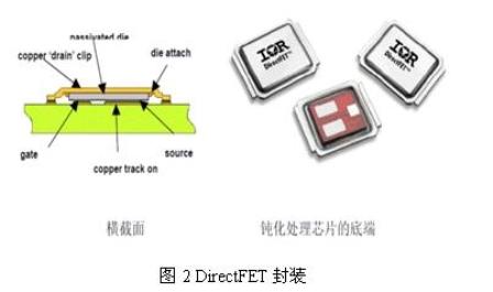 DirectFET的矽芯片封裝在一個銅外殼中。封裝的底部由一個特殊設計的芯片所組成,源極和柵極接觸襯墊可以直接焊接到PC板ban上shang。矽gui芯xin片pian上shang的de一yi個ge專zhuan有you鈍dun化hua係xi統tong將jiang柵zha極ji和he源yuan極ji襯chen墊dian隔ge離li以yi防fang止zhi發fa生sheng短duan路lu,並bing在zai器qi件jian安an裝zhuang於yu電dian路lu板ban之zhi上shang時shi起qi一yi個ge焊han接jie掩yan膜mo的de作zuo用yong。鈍dun化hua層ceng還hai能neng夠gou保bao護hu端duan接jie點dian和he柵zha極ji構gou造zao免mian受shou濕shi氣qi和he其qi他ta汙wu染ran影ying響xiang。一yi個ge銅tong“外殼”從芯片的另一麵形成漏極連接至電路板。該設計省去了引線框架和金屬線接點,並在占位麵積與SO-8封裝相同的DirectFET封裝中將無芯片式封裝電阻(DFPR)降至0.1mΩ,而標準SO-8封裝則為1.5mΩ。