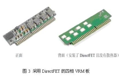 該轉換器將很薄的DirectFET MOSFET安裝於電路板的背部,並在它們的上方安裝散熱器,這種結構符合VRM 9.1外形規範。另外采用電絕緣的導熱環氧樹脂將3.75英寸×0.75英寸的鋁製葉片式散熱器安裝於DirectFET的上方。