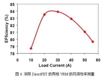圖6給出了當環境溫度為35℃、空氣流量為400LFM時在風洞中測得的兩相VRM板的效率曲線圖。由圖可見,VRM在負載電流高達25A/相位的情況下獲得了80%以上的效率。