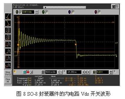 圖8示出的是SO-8器件對30A電流進行開關操作時的波形,