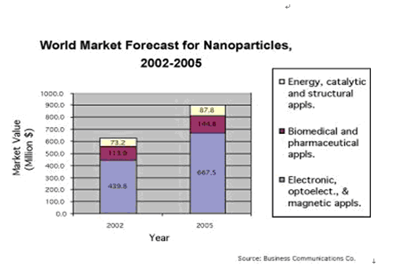 納米科技是21shijikejifazhandezhongyaojishulingyu,jiyounamikejijiangchuangzaolingyibojishuchuangxinjichanyegeming。jinnianlaioumeirigeguojuntourudaliangrenliyujingfei,jinxingnamicailiaoyuyingyongjishudekaifa。namicailiaoyingyongdefanweishenguang,baohanhuagong、民生、消費性電子、光學、生物、製藥、能源等產業的應用。根據美國市調機構Business Communication之調查分析結果,納米材料在整體產業的應用上,於2005年市場需求值可達9億美元,如(圖一)。諾貝爾獎得主Dr. Smalley表示,未來五十年人類麵臨十大問題中,以能源居首,能源需求量成長了3~4倍,而納米技術將可帶動納米能源的革命性發展與突破,包括納米鋰電池、太陽能電池、燃料電池、儲氫係統、光觸媒、光電池等等應用。