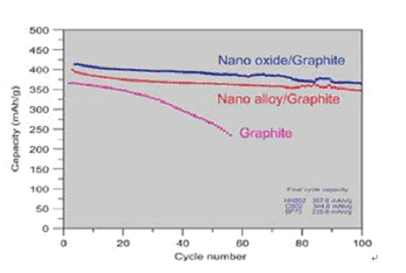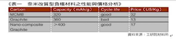 其中,經由高能量研磨的納米合金粉體(SnSb, LiSnM alloy, LiM alloy, M=Al, Fe, Si, In),雖然具有一些延性納米結構組織(ductile structure),可以防止合金材料在鋰離子的充放電測試中,所造成之合金膨脹與碎裂,提高了材料的壽命;然(ran)而(er)不(bu)可(ke)逆(ni)容(rong)量(liang)太(tai)高(gao)及(ji)材(cai)料(liao)導(dao)電(dian)度(du)低(di),仍(reng)需(xu)要(yao)進(jin)一(yi)步(bu)克(ke)服(fu),才(cai)能(neng)夠(gou)應(ying)用(yong)於(yu)鋰(li)電(dian)池(chi)負(fu)極(ji)材(cai)料(liao)。而(er)利(li)用(yong)納(na)米(mi)表(biao)麵(mian)改(gai)質(zhi)技(ji)術(shu),將(jiang)納(na)米(mi)氧(yang)化(hua)物(wu)或(huo)納(na)米(mi)合(he)金(jin),在(zai)碳(tan)材(cai)表(biao)麵(mian)所(suo)形(xing)成(cheng)的(de)納(na)米(mi)複(fu)合(he)負(fu)極(ji)材(cai)料(liao),除(chu)了(le)具(ju)有(you)較(jiao)高(gao)的(de)電(dian)容(rong)量(liang)(>420mAh/g),約較傳統碳(320mAh/g)的電容量高出40%,如(圖四)。這種納米改質的納米複合負極負極材料,又擁有價格低的優勢,未來是具有市場競爭力,如(表一);將此技術應用於石墨負極材料,更可以大大提升石墨在PC-baseddianjieyexitongdeshouming。zhezhuyaoshiyinweikaoshimobiaomianshangdenamiducengkeyifangzhishimocengbiaomianyudianjieyedefanying,eryizhishimocengdepengzhangyuboli,bingshidianchiderongliangyushoumingyanchang。