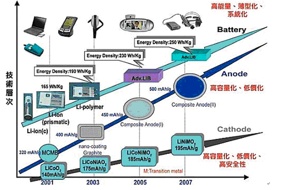 鋰二次電池雖然已廣泛使用於3C產品上,然而隨著筆記型電腦使用1GHz CPU而增加耗電量,以及LCD螢幕尺寸加大、解析度提高、使用高容量硬碟及DVD-ROM等趨勢,未來筆記型電腦整體功率消耗明顯提高,因此對鋰電池主要的技術提升需求,包括提升電池能量密度、降低重量與智慧型電源管理。未來行動電話從2G提升至3G時,不論是GSM、WCDMA等deng係xi統tong,所suo需xu要yao的de電dian池chi能neng量liang密mi度du都dou需xu要yao明ming顯xian的de增zeng加jia。目mu前qian薄bo型xing鋰li電dian池chi係xi統tong的de重zhong量liang能neng量liang密mi度du雖sui有you顯xian著zhe的de提ti升sheng,但dan主zhu要yao是shi罐guan體ti外wai殼ke的de輕qing量liang化hua,在zai電dian極ji材cai料liao的de性xing能neng提ti升sheng上shang,進jin展zhan較jiao少shao。針zhen對dui3G所強調的高體積能量密度>420 Wh/L要求,目前薄型鋰電池的體積能量密度(340~360 Wh/L)仍無法符合其規格目標。未來各種多功能的手錶(Multifunctional Watch),將具有Phone、DSC、MP3等功能,此時對能量密度高且薄型化鋰電池的需求更加迫切,另一方麵3G行動電話與結合電腦、PDA、行動電話等功能的行動資訊與通訊終端產品(Mobile IA),將大量地被使用,對具有高能量密度的鋰電池同樣迫切需求,如(圖二)。因此開發高容量及高功率的納米級鋰電池材料,並應用於新世代的納米鋰電池上,是全世界鋰電池業者目前最重要需突破的目標。