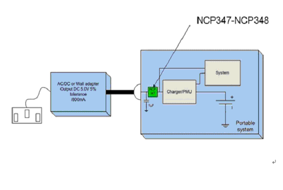OVLO所定的電平必須高於AC-DC的最大輸出工作電壓並低於係統首個元件的最大額定電壓。圖1所示為一個基於全集成OVP器件的典型便攜式設備的結構(此處的OVP采用的是NCP347MTAE)。