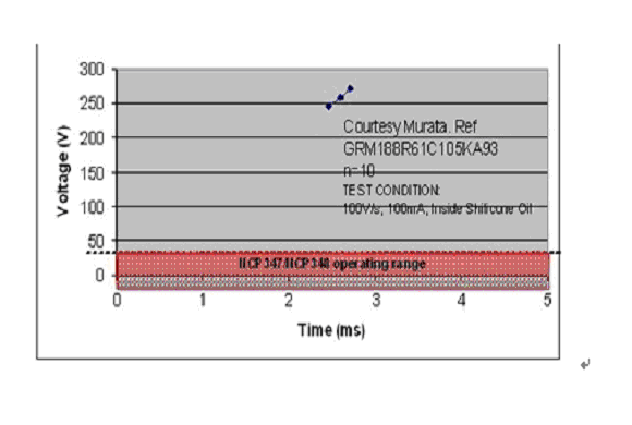 首先要檢查的是該電容的直流偏置曲線,以保證其工作時所能承受的電壓高於UVLO到 OVLO這個電壓範圍。例如,假設保護器件前方需要一個1µF的陶瓷電容。