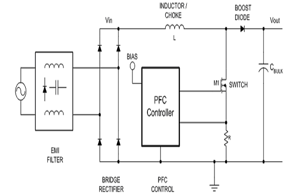 [圖中文字:電感/扼流線圈、升壓二極管、PFC控製器、功率開關、橋式整流器、PFC控製、EMI濾波器]