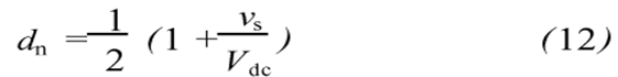單相電壓源型有源濾波器直流側以電容作為儲能元件來維持直流電壓Vdc恒定。設開關周期恒定為T,第n個開關周期內占空比為dn,則這個開關周期內兩對開關管分別導通的時間為dn*T和(1-dn)*T,從而分別可以得到兩個電壓平衡方程: