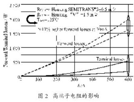模塊的端子電阻對電路的工作效率的影響如圖2所示。在圖2所示的例子中,舉例的開關導通損耗比SEMITRANS高11%。這相當於一個每相絕對值約90 W,三相共270 W的功率變頻器。