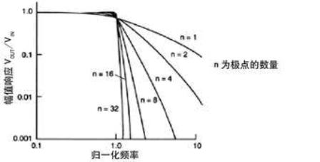 圖1 幾個低通濾波器的幅值響應與歸一化頻率的關係曲線。如果濾波器傳遞函數有多個極點(或階數),則頻率越高,衰減越快。