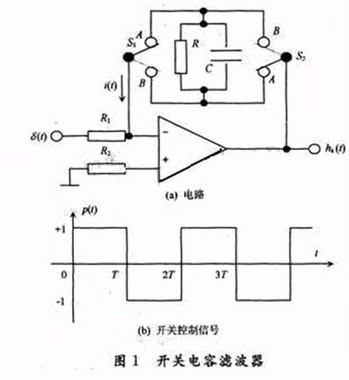 開關電容有源濾波器電路如圖1(a),其中S1和S2是由周期為2T的方波信號控製的理想電子開關,方波控製信號p(t)波形如圖1(b),其占空係數為0.5。即在2kT<t<(2K+1)T期間兩開關接通A點,在(2K+1)T<t<(2K+2)T期間兩開關接通B點,其中K=0,1,2,…,是時段編號。