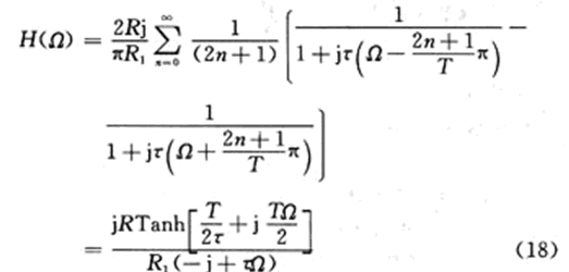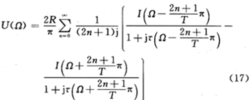 上式說明,Ie(Ω)是輸入電流頻譜I(Ω)周期延拓的組合,周期為Ω0=2π/T。各電流分量流過RC並聯支路時的電壓為相應電流分量與RC支路阻抗(R/(1+jωτ),ω=Ω±(2n+1)π/T)的乘積,於是輸出電壓頻譜U(Ω)為: